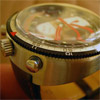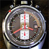 The Pupitre is a manual wind chronograph with tachymeter and stainless steel case. The stem is at 12:00 with the chronograph buttons at the top like a stopwatch. There is a date window at 3:00, a 30 minute counter at 12:00, and a 12 hour counter at 6:00.